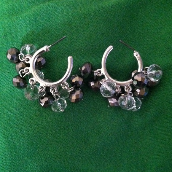 Silver hoop earrings with black, gray, and clear beads dangling around the hoop!
