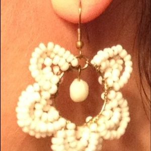 Small white beaded flower dangle earrings
