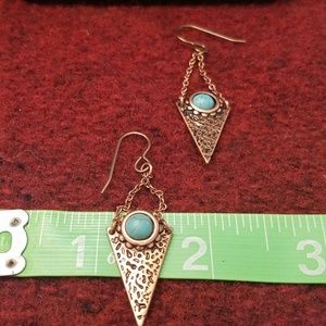 Brass triangles with a turquoise colored "eye" accent hanging from chain