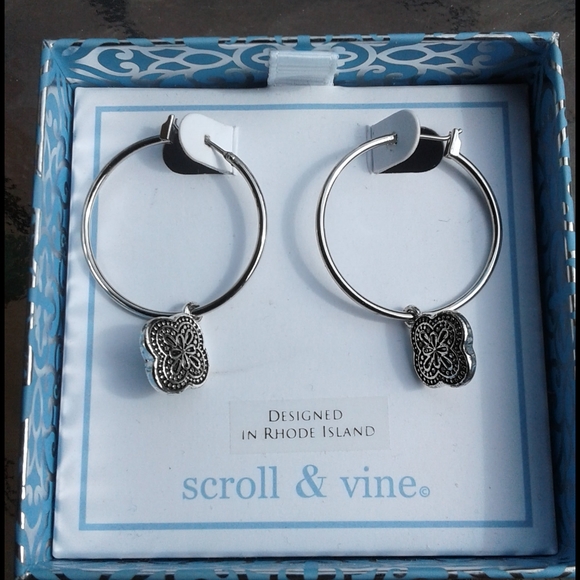 For pierced ears. 1 inch hoops with flower hanging down. Designed in Rhode Island by scroll and vine. NWOT