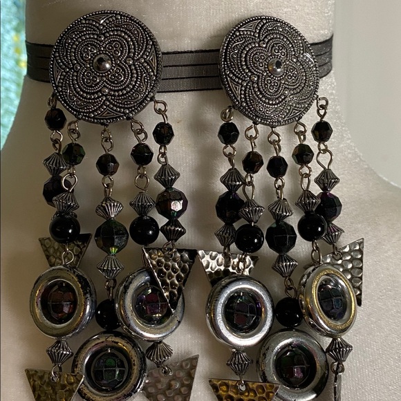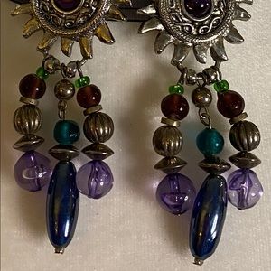 Western style silver clip earrings with purple and turquoise accents.