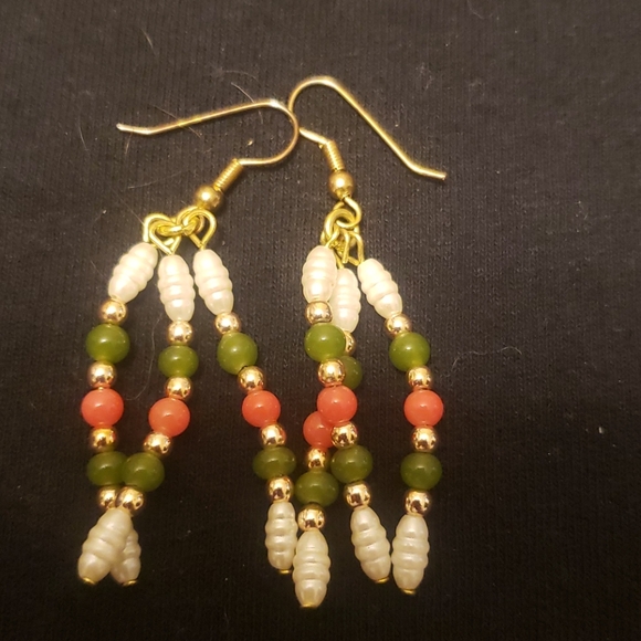 Gold dangling earrings with white, green and coral beads.
