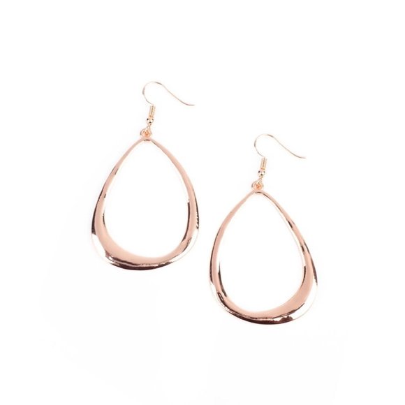 Featuring a shiny finish, an asymmetrical rose gold teardrop swings from the ear for a classic artisanal look. Earring attaches to a standard fishhook fitting.