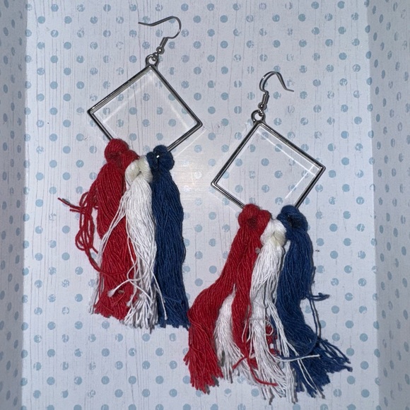 Made by a small business in West Virginia. Wonderfully patriotic earrings with a geometric shape and red, white, and blue colored yarn/string/etc.