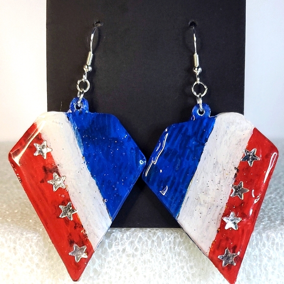 Stay in style with these fabulous EARRINGS, Wood base, light in weight. 2 1/2" in L and 2" W. Hand painted Red, White, Blue stripes and embellished with Acrylic Stars and coated with resin for a dazzling shine. Hook style with silicone back for lock in support.