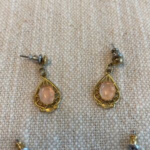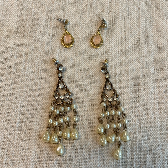 Two pairs of earrings. Shorter pair is gold tone with pink gemstone accent. The longer pair is bronze with pearl like drops.
