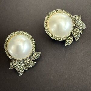 Beautiful pierced pearl and marcasite earrings, sterling silver, excellent quality