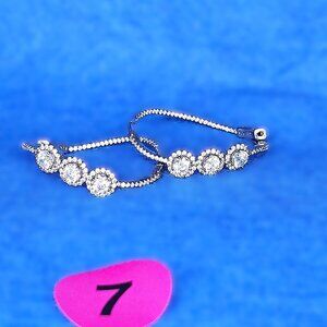 Three round CZ's surrounded by a ring of smaller round stones creating a halo