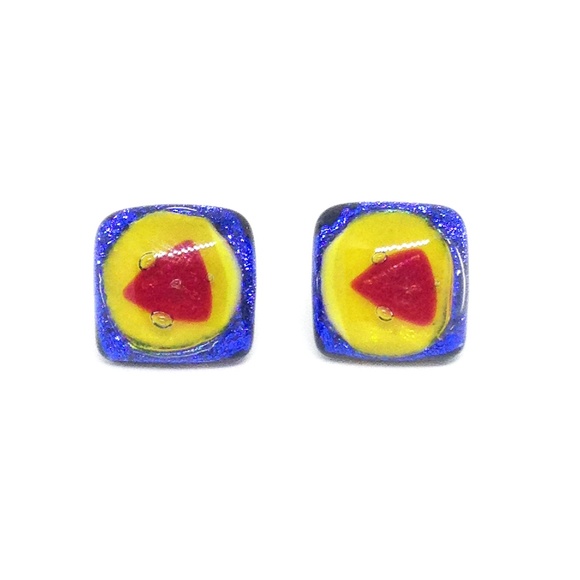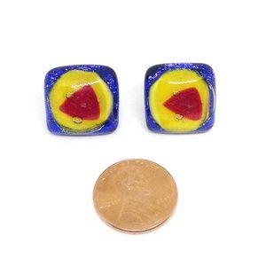 Beautiful!! Artisan made statement earrings with hand fused glass. Glass quality is amazing: layers of subtly sparkling color, red, yellow and blue. Design includes primary shapes: triangle, circle, square. Standard posts for pierced ears. High quality sterling silver butterfly backings. Total weight 8.2 grams.