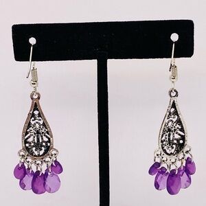 A fishhook pair of earrings features silver tone dangle and purple acrylic beads.