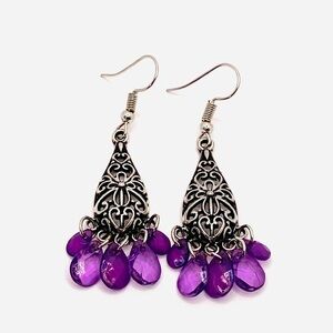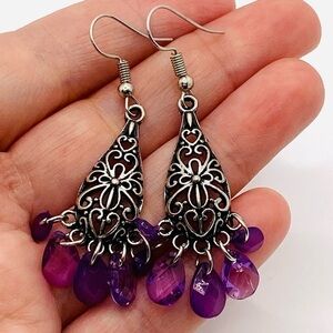 A fishhook pair of earrings features silver tone dangle and purple acrylic beads.