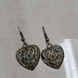 Brassy colored hearts and hooks with black and green filling.