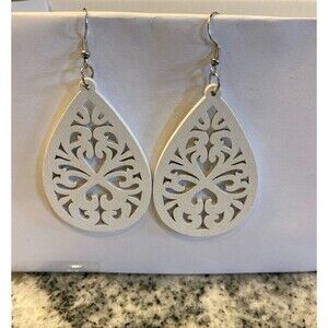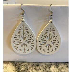 Earrings Large Teardrop Wooden Laser Cut White Dangle Boho Hippie Unique