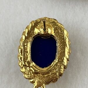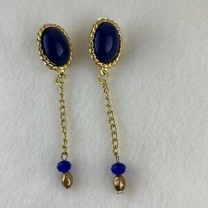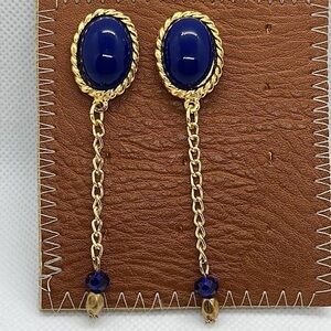 Chains dangle from the oval shaped earrings with blue and gold tones