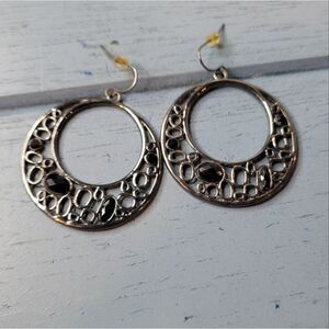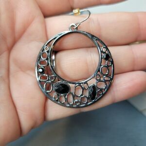 Earrings Pierced Drop Hoops Silver Tone Black Gems