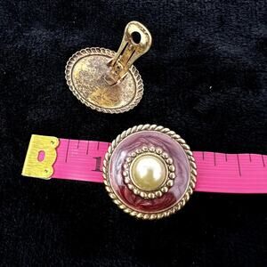 Earrings Round Pearl Like in Center Dome Rope Like Accent Exterior and Interior Clip On Vintage VTG Fashion Classic Statement 60s 70s 80s Gold Tone Beige Burgundy