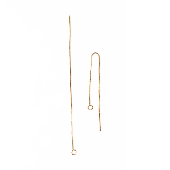 Elegant & versatile! Gold tone box chain threader earrings. Standard gauge post on one end for easy wear. Silver plated, stamped '925'. Chain is under 1mm thick.