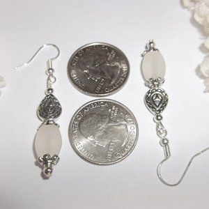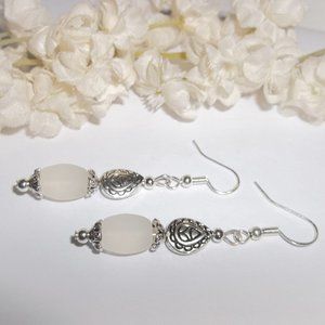 These dreamy, beaded earrings are brand new & handmade by me - wvluckygirl. Done with frosted white beach sea glass beads and antiqued silver toned costume jewelry beads. The pair dangle & drop from 925 sterling silver French fishhook ear wires for women's pierced ears. Nickel safe. Measure 2 1/4 inches tall & 3/8 inch wide. Each single earring weighs 2.9 grams. The perfect fashion accessory for her! Also makes a great gift idea for that hard to shop for woman. Buy it now before someone else does!