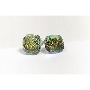 Earrings, Yellow Gold Dichroic Glass Stud Earrings, NEW, square, Handmade