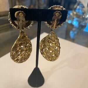Earrings amethyst Centerstone, with silver embellishment that looks like beading on the clip part emerald and amethyst and crystal stones on the drop which is gold
