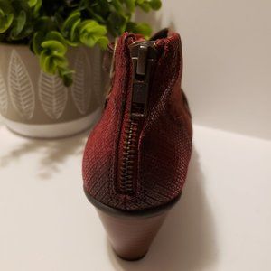 They are a beautiful deep red color with a slight orange tint and fade on the toes, and I love the strap design. The back heel zips work great too even though I don't normally have those.