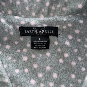 Earth Angels Gray & Pink Polka Dot Pajama Set Soft Satin Accent Size Large. Super soft and snuggly. Very warm. Long Sleeve Button up top with pocket and gross grain ribbon tied elastic waistband bottoms. Oversized and thick. Approximate measurements in photos.
