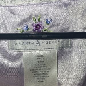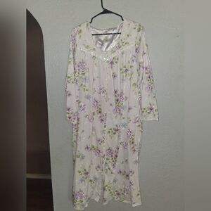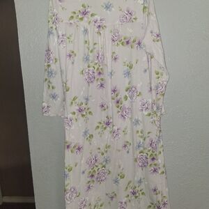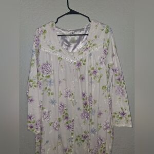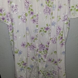 Earth Angels Vintage Satin Floral Purple Snap Front Long Sleeve Night Gown S. Top button closure flawed as shown in picture, but other than that good pre-owned condition