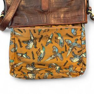 genuine leather, brown leather, fleece lining, duck pattern, adjustable strap, distressed leather, eco-friendly bag, casual shoulder bag, Korean made, rustic accessories