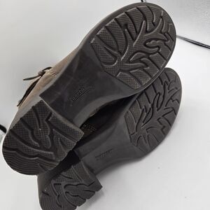 Earth Big Sky Tall Riding Leather Boots in Charcoal Brown size 8.5B. These knee-high boots feature a round toe shape, zip closure, low block heel, and slip-resistant outsole made of rubber. The boots are lined with faux fur and cushioned for added comfort, making them perfect for winter and fall seasons. With a vintage style and western-themed accents, these riding boots are ideal for various occasions such as casual outings, workwear, formal events, or even parties. Perfect for those looking for a stylish and versatile footwear option.