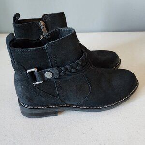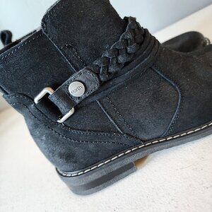"NEW" Fantastic Black Suede/Leather Bootie By Earth. Inside Zip Entry, Almond Toe, Removable Cushioned Memory Foam Insoles with Extra Arch Support, Braided Leather Strap Accent, Soft Textile/ Faux Suede Lining, Rubber Grip Soles with Low Heel, New, Never Worn, Only Tried On, Tags :) Rt.150.00 approx. Size 6, Foot Bed Measures 9.5" for Reference.