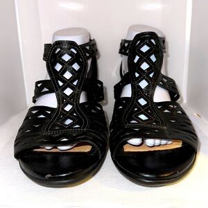 Leather upper. Man made sole. Wedge heel. Zipper at heel. Smoke free home.
