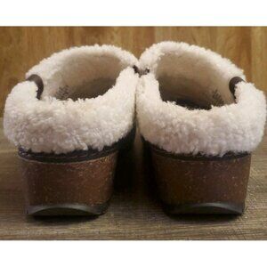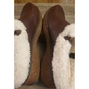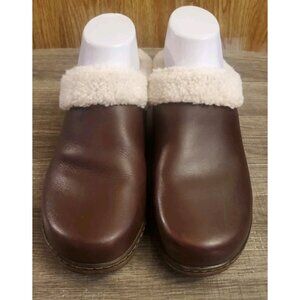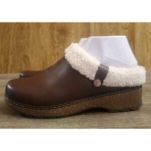 The Earth Etkona Clogs in women's size 8 are a comfortable and stylish option for casual wear. These brown clogs feature a slip-on design with a round toe and a wedge heel, making them perfect for travel or everyday activities. The leather upper material, standard shoe width, and earthy theme ensure both comfort and a trendy look for the fall and spring seasons.