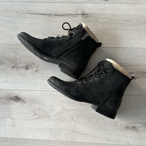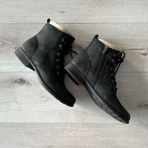 • Burnished suede upper, lace-up design, inside zip entry, back pull tab