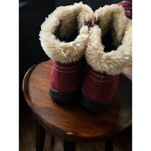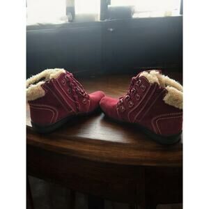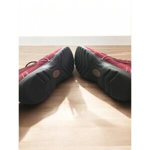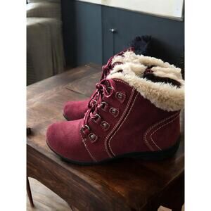 The Earth Origins Crowley boot is a red leather lace-up ankle bootie for women in size 10. It features a stylish Earth brand design, with a comfortable ankle shaft style and durable leather upper material. Ideal for any casual or outdoor setting, these boots offer a mix of fashion and practicality.
