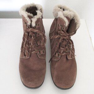 Earth Origins "Crowley" Womens Tan Leather & Faux Fur Side Zip Hiking Boot. Size 11M. Previously owned and lightly used, leather uppers are in excellent condition, while the ribbed rubber soles reveal light wear.