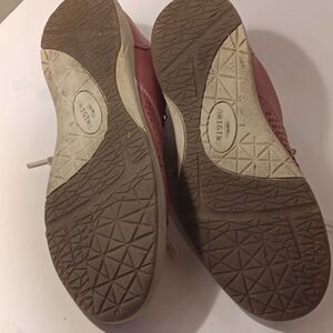 Premium leather sneakers in classic brick red. Arch support, cushioned memory foam footbed. Trotters removable insole. Reinforced heel, padding here. Zipper with laces for a perfect fit. Perforated sides. Treaded sole. Size 7.5 Excellent condition.