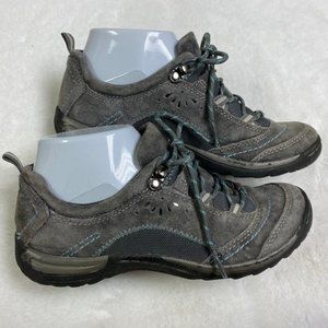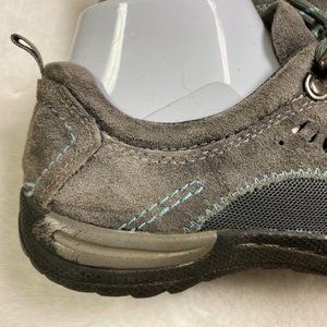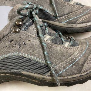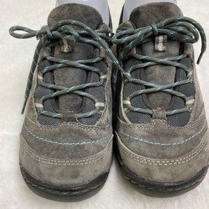 Earth Origins comfort in these leather and fabric walking shoes. Get ready for the beautiful summer weather and hiking in these. Shoes are an great used condition. Soles show normal wear and laces are also in great condition. Very nice arch support. These are gray with small amounts of teal trim.
