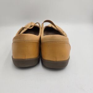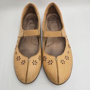 Earth Origins Size 9 Wide Mary Jane Sandals Flats in yellow vintage are a stylish and comfortable option for women. Featuring a round toe, slip-on closure, and cushioned insole, these flats are perfect for travel, casual wear, and work. The leather lining and upper material, along with the rubber outsole, provide durability and comfort. The Mary Jane style with flower cutouts adds a feminine touch, making them a great choice for those who appreciate nature and a bohemian vibe. These sandals are a versatile and trendy addition to any wardrobe.