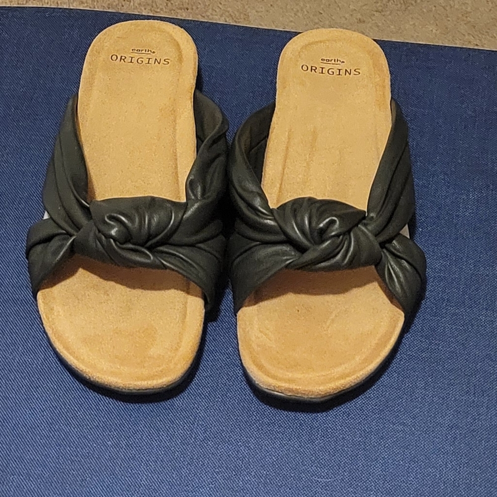 NWOT. Earth Origin, slip-on sandals. Black leather, with twist knot on front. Size 9 Wide
