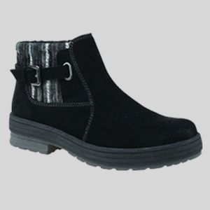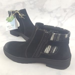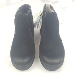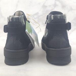 Earth Origins TATE Black Water Repellent Suede & Knit Short Ankle Boots. Rain, snow & sleet water-repellent suede upper. Toe & back heel area intentional distress burnishing detail. Contrast stitching. White, grey & black striped tonal knit fabric ankle. Adjustable strap & buckle. Black zip closure. Padded insole. TPR outsole. Upper: Leather & fabric; fabric lining. New in box! Size 5M.