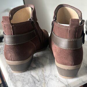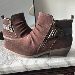 Brand new in box. ***SIZE 9 WIDE*** Color: Bark. Eco friendly style never looked so good with its sustainably sourced suede adding a new level of sophistication and comfort to the side zip bootie. Functional Zipper. Heel Height: 1.75"