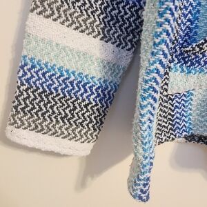 Women's blue, white and black striped burlap hoodie shirt by Earth Ragz, size medium. V-neck collar. Listed as a women's but can be unisex. Front pouch pocket to hold your essentials. Please check provided measurements to determine best fit. Fabric blend of acrylic, polyester and cotton. Excellent pre-owned condition; no flaws.
