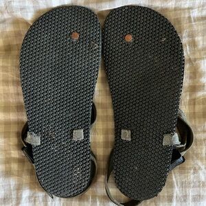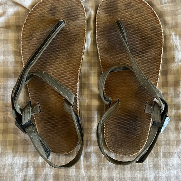 Stylish brown sandals with olive straps. Perfect for casual wear.