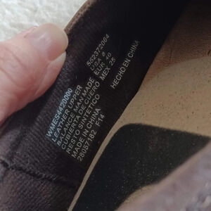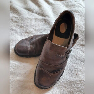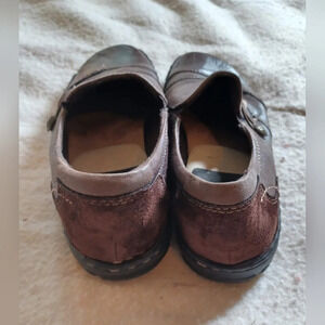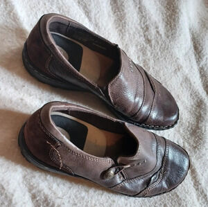 brown leather suede upper slip on loafer shoes women size 8 man made sole feels like a type of rubber with good tread not new gently worn condition