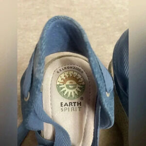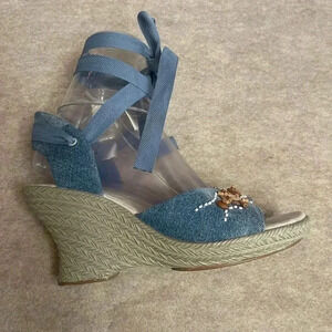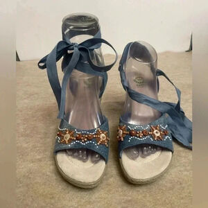 Earth Spirit Gerlon 2000 Monroe Blue Denim Beaded Lace Up Wedge Sandals Size 8.5