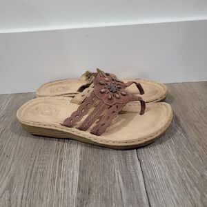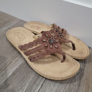 The Earth Spirit Women's Wedge Sandals in size 9.5 are perfect for those embracing a boho, hippie, or fairy style. Made of leather with beaded accents, these strappy sandals feature a slip-on closure and a comfortable wedge heel. The brown color and solid pattern give them a versatile look, while the cushioned and breathable design ensures all-day comfort. Ideal for festivals or everyday wear, these Earth Spirit sandals are a chic addition to any woman's wardrobe.