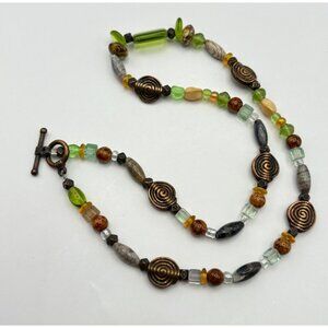 Earth Tone Beaded Necklace with Copper Spiral Accents Faux Stone Boho Nature