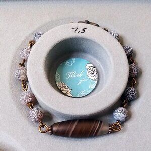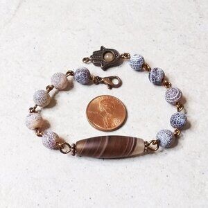Made from various types and colors of Agates - from frosted Dragonvein Agate round beads to the elongated Banded Agate Center Drum Bead. Hardware, Hamsa Hand and connectors are copper. This bracelet will best fit wrists 7 - 7.5" . Need it a touch longer? Ask me to add a chain extender to bring it up to size for you! Any modifications are free of charge with a full price purchase.