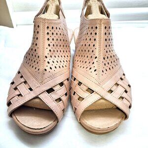 Shoes have a woven design near the peep toe, and cutwork on the top.