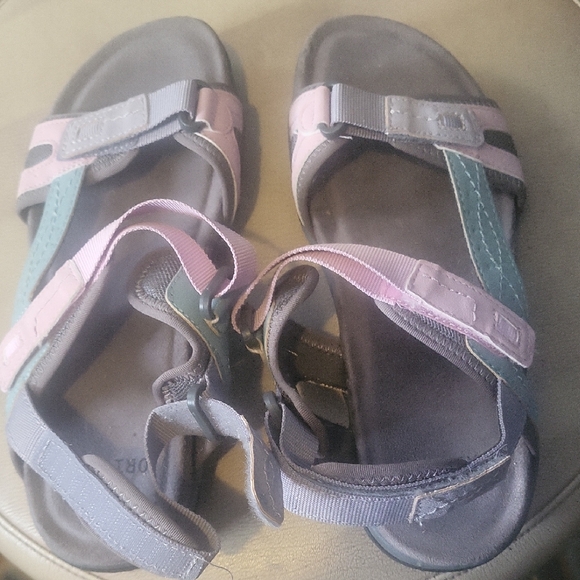 Chic Earth sandals with pink and gray straps. Perfect for casual outings. Comfortable and stylish.